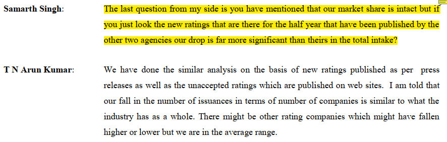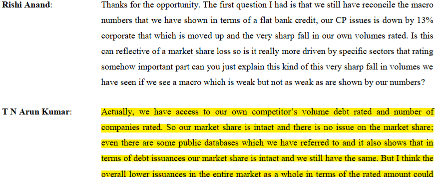 We will have to observe the revenue pattern of ICRA and CRISIL over the next 3/4 quarters to get more data to confirm this hypothesis since it will be more than a year since a slowing economy and reduction in bank credit growth.
