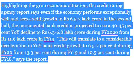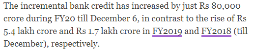 The bank credit growth has definitely seen a severe deceleration. The incremental bank credit growth has only been around Rs 80,000 Cr in the first nine months of FY20 compared to around Rs 5.4 Lac Cr in the corresponding period of FY19.