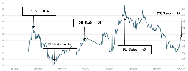 Just before the global financial crisis, CRISIL was trading at a PE ratio of 46 in 2008. The PE ratio fell to 16 in the depths of the financial crisis and increased to 35 by Jan-2014. Then the PE ratio touched a high of 63 in Jan-15 to now come down to 36 in Jan-20